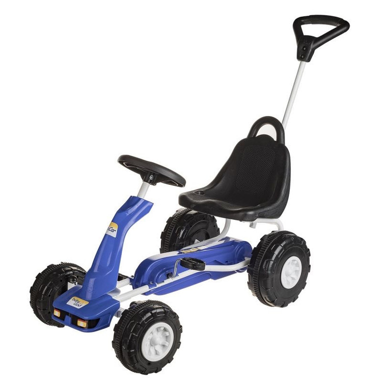 ماشین چهار چرخ بیبی لند تاب کار با اسکلت فلزی دارای اهرم کنترل فرمان و تحمل وزن تا 70 کیلو وهمچنین پدال برای حرکت با استفاده از زنجیر وتنوع رنگ آبی ، قرمز ، مشکی