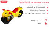 سایز توضیحات : مناسب برای کودکان بالای ۲ سال - دسته ها و تمامی اجزا با قابلیت جداسازی - فاصله نشیمن گاه تا زمین: ۲۴ سانتی متر - وزن قابل تحمل: ۴۰ کیلوگرم - قابلیت پخش یک موزیک کودکانه - دارای یک باکس موزیکال - دارای یک
