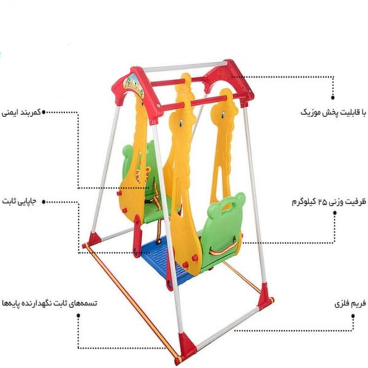 دارای جاپایی ثابت - باقابلیت پخش موزیک - دارای سه عدد باتری ساعتی قابل استفاده در فضای بیرون و داخل - دارای تسمههای ثابت نگهدارندهی پایههای فلزی - نشیمن دارای